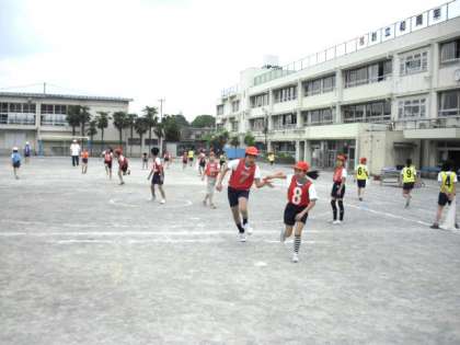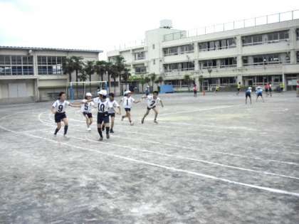チームごとにバトンの受け渡し練習しました。(5月17日)