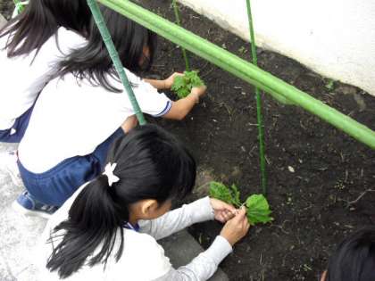 先日植えたゴーヤの苗に支柱をつけました。校長先生に支柱に固定する方法を教えていただき、子どもたちが完成させました。(5月17日)