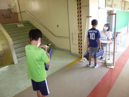 学習課題渡しのための分散登校 公開日 2020/05/11 更新日 2020/05/11 おしらせ 今日は、3〜6年生に学習課題を渡す日でした。久しぶりに学校に来た子もいたようです。校舎に入ったところで手を洗いました。それぞれの学年の教室の前の廊下で学年の先生とパーテーション越しに話をしました。話したいことはたくさんありますが、できるだけ短時間で帰るようにしました。お家でも計画的に学習に取り組むようにしましょう。