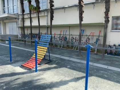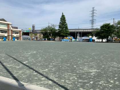 がっこうでは たいいくのじかんに こうていで うんどうしたり、やすみじかんに こうていで あそんだりします。