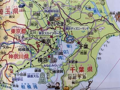都道府県の勉強をするために、みなさんはこの前配られた地図帳を使っていると思います。この地図帳には、都道府県や庁所在地の名前だけでなく、そこで有名な食べ物やたて物、かん光地などいろいろなじょうほうがのっています。例えば23ページの東京都やそのまわりの地図をよく見ると「東京スカイツリー」や「東京ディズニーランド」が見つかるはずです。