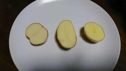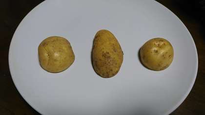 ちなみに写真のじゃがいもは、左から「だんしゃく」、「メークイン」、「キタアカリ」です。よーく見ると、形のちがいや、切った中身の色のちがいが分かりますね。