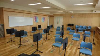 4〜6年生の音楽は、6月15日からスタートします。「3密」にならないように、いすを18脚だけ並べて、間に譜面台を置いてみました。