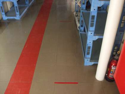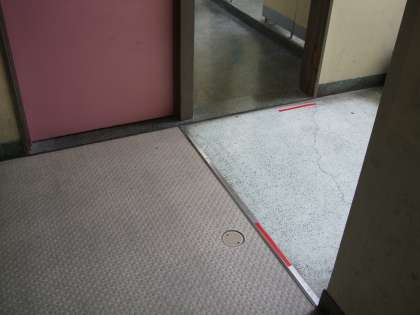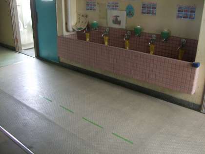 トイレや手あらいのときに、みんなが「密(みつ」にならないようにするための、待つ位置の目印です。