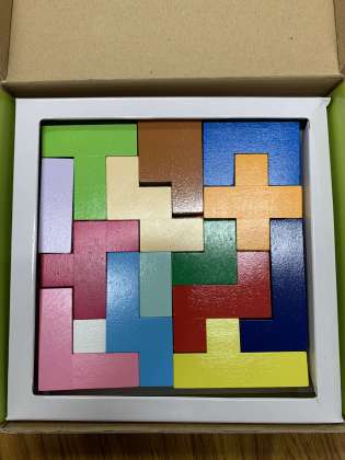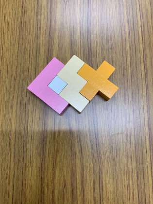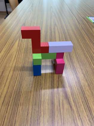 教材の名前は「立体パズル」です。ブロックを組み合わせて形を作ったり、立体的な形も作れます。先生は魚と馬を作りました。