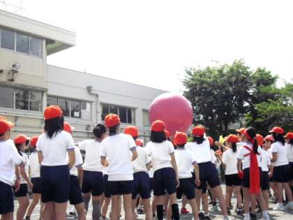 大玉送りに練習をしました。運動会当日は、どちらが勝つでしょうか。(5月25日)