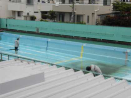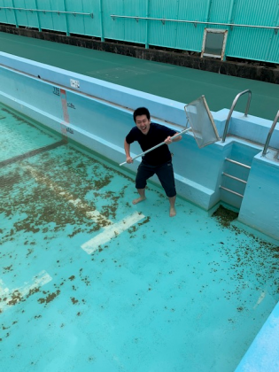 今日は、せいそう業者の方がプールをそうじしてくれていましたね。