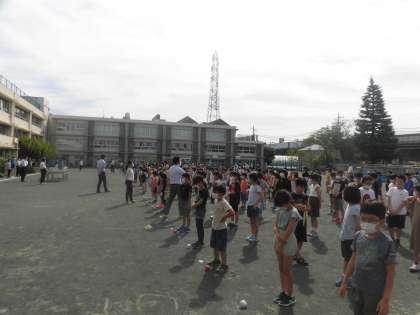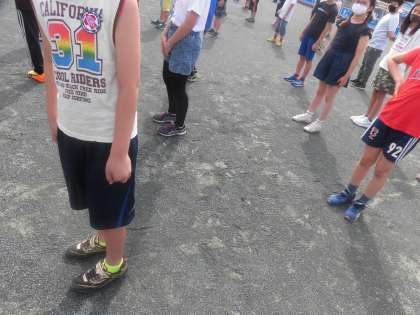 2ヶ月遅れで、始業式をようやく行うことができました。午前中Aグループは校庭で実施し、ソーシャルディスタンスに基づいて、今までより前の友達との距離をとって並びました。