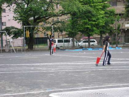 早朝、運動会のリハーサルに向けて、校庭のライン引きをしています。(5月27日)