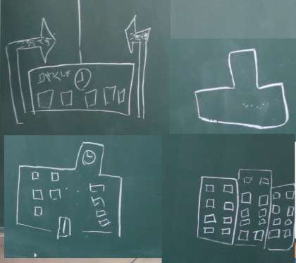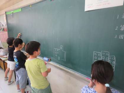 できた絵を見て、「学校じゃん。」「ビルみたい。」「なんだこれ。」