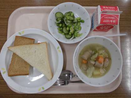 今日は二色サンドでした。少し黒っぽい黒砂糖食パンには「クリームチーズ」、白い食パンには「いちごジャム」をはさみました。みなさんはどちらがお好みですか?