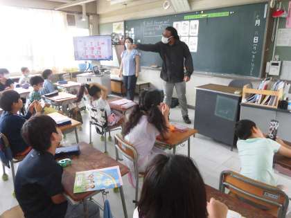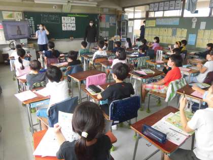 外国語の授業で、How are you ? のあいさつ表げんを学習しています。