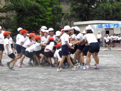 3年の赤と白全員がかけっこしながら竹の棒を目指しました。自分の陣地に多く竹の棒を引っ張ってきた方が勝ちです。(5月31日)