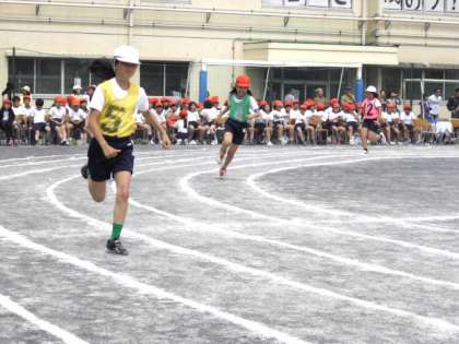 3年生の80m走です。3年生になってかけっこが徒競走となり、距離も長くなりました。スピードを落とさず、うまくコーナーを曲がってゴールを駆け抜けました。(5月31日)