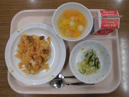 今日は「チーズ入りチキンライス」でした。ふつうのチキンライスも、もちろんおいしいですが、チーズを入れるとコクがでて、もっとおいしくなります。子どもたちも大好きなメニューです!