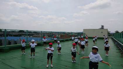 縄跳びを使って、前跳びや駆け足跳びを練習中です。