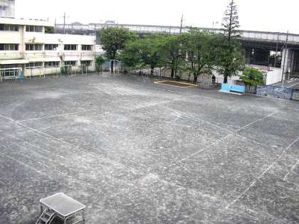 雨が降り、子どもたちは校舎内で過ごしました。校庭には、運動会のライン後がまだ残っています。(6月2日)