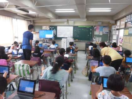 ロイロノートへのログインは、初めての文字入力にくせんしながらもローマ字表片手にけんめいに入力するすがたがありました。