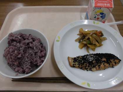 今日のごはんには、黒米を混ぜて炊きました。ぷちぷちとした食感がおいしいです。