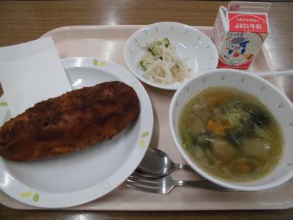 春雨スープは給食の人気メニューですが、今日はさらに肉団子をたくさん入れました。お肉と野菜のうま味がしっかりでて、おかわりしたくなるおいしさでした。