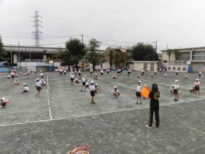 運動会練習が始まりました。4年生は「紅蓮華」の音楽に合わせ、旗を2本持ち、表現をやります。