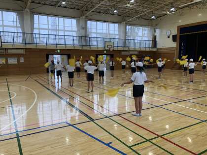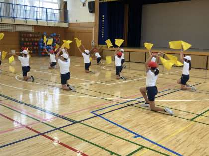 フラッグを持っての練習を始めました。1組赤、2組緑、3組黄色、4組緑とクラスごとに色が違います。フラッグを持って行うと華やかになりました。動きがそろうととてもきれいになります。まだまだそろわないところもありますが、何度も練習して少しずつ上達していきました。