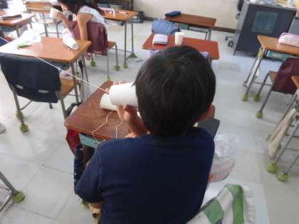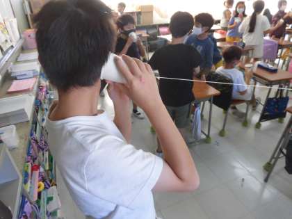 理科(3年生) 公開日 2020/09/29 更新日 2020/09/29 3年生 9月28日 理科「音でつたえよう」で糸電話を作りました。 糸電話はなぜ音が伝わるのかを考えながら、遊びました。 音は物が振動して伝わっていくことをしっかりと理解できましたね。 3年