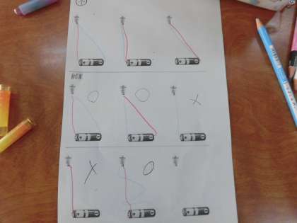 豆電球を点灯させる方法を考え、実験を行いました。