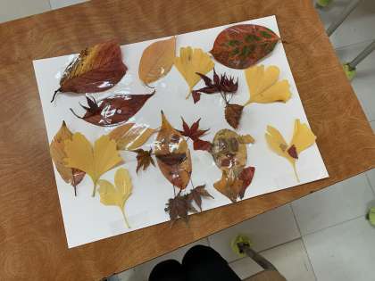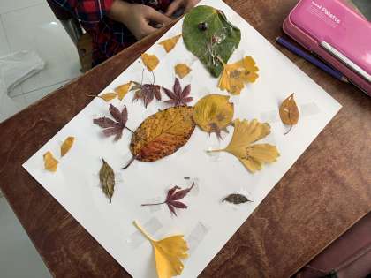 紅葉やイチョウなど様々な種類の落ち葉や木の実を使って、絵を描きましたね。