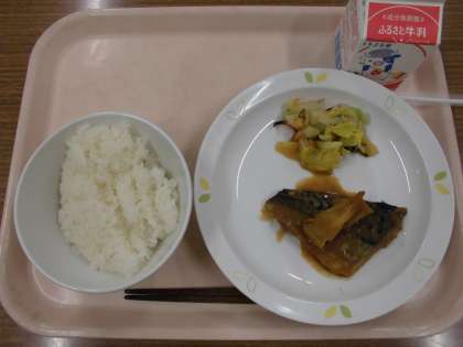 さばのみそ煮は、回転釜で1時間以上煮て作りました。一緒に煮たねぎもトロトロになって絶品です。大人からも子供からも人気のメニューです。