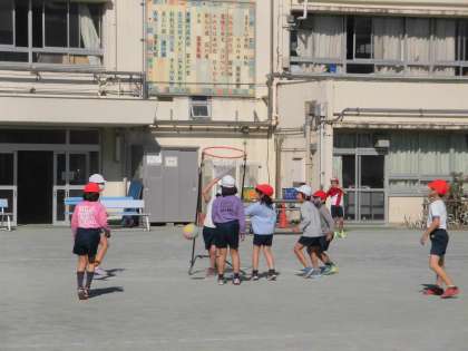 セストボール(3年生) 公開日 2021/01/14 更新日 2021/01/14 3年生 1月14日 体育でセストボールの学習を進めています。 セストボールは、バスケットボールに似た球技です。ドリブルはできず、地上に置かれたゴールに360度どの方向からもシュートが可能という特徴があります。 【ボールを持っていないときにどのように動いたらいいのか】を考えて運動しています。 相手コートまでボールを運ぶ動作やパスがもらえる位置に移動することが上手になってきています。 3年