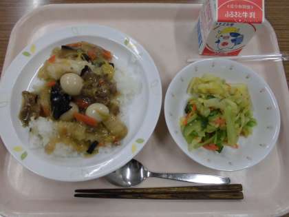 1月27日の給食 公開日 2021/01/29 更新日 2021/01/29 その他の教育活動 (今日の献立) ・中華丼 ・ピリ辛やさい ・牛乳 中華丼は、野菜もお肉もたっぷり入れて作ります。それぞれのうま味が出て、今日もおいしくできました。