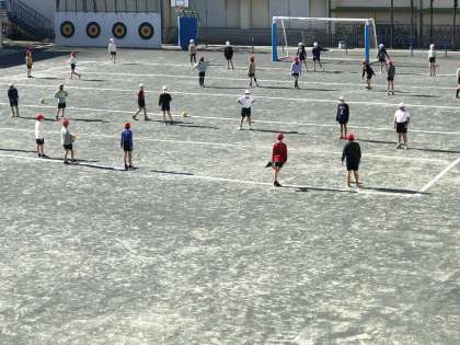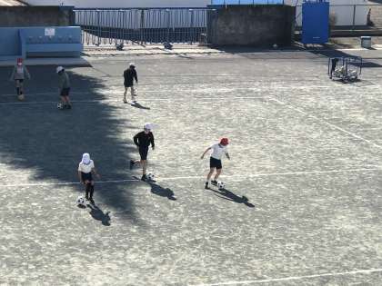 校庭での体育では、「グリッドサッカー」の学習を始めました。まずは、ドリブルやパスなどの基本的なことに取り組みました。