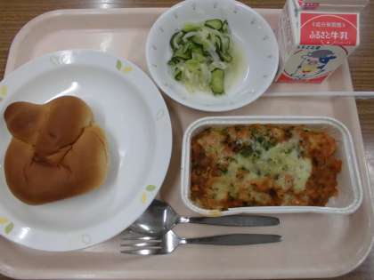 ラザニアは、給食室で手作りしたミートソースとホワイトソースを合わせてから、カップに流して焼いています。クリーミーでコクがあり、人気のメニューです。