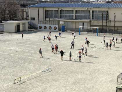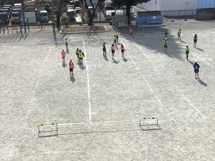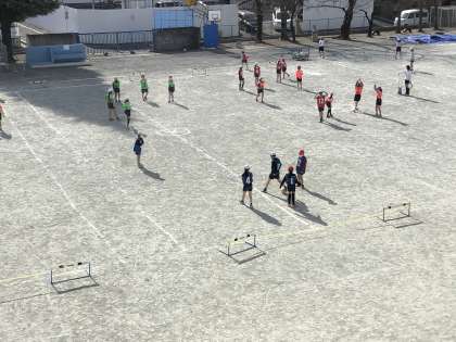 体育【4年生】 公開日 2021/02/15 更新日 2021/02/15 4年生 「グリッドサッカー」では、ゲームを行うようになりました。通常のサッカーと違い、1つのコートを2つのエリアに分けています。両方のコートを行き来することができないので、チームで協力することが大切です。 初めはルールを覚えることに苦戦していましたが徐々に慣れていきました。一人の力でゴールすることが難しいので、パスをしたり、声を掛け合ったりして取り組みました。