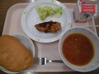 パンにフィッシュフライとボイルキャベツを自分ではさんで食べるフィッシュサンド。1年生にとっては初めてのメニューでしたが、上手にはさんでほおばっていました。