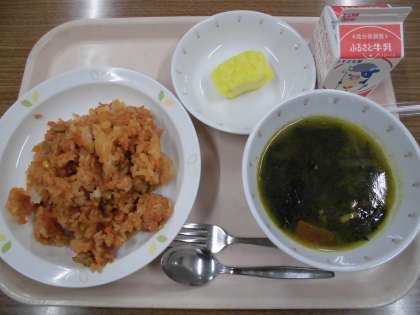 今月のオリパラ給食は、「ナイジェリア」の料理でした。ジョロフライスは、トマト風味の炊き込みごはん、クミンやナツメグなどスパイスも使って大人の味です。エグシスープのエグシとは、メロンの仲間の果物のことです。本来は、その種を入れるのですが、日本では手に入らないので、そのほかの食材や味付けはそのままに、再現しました。
