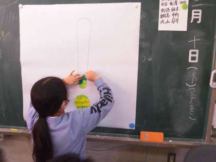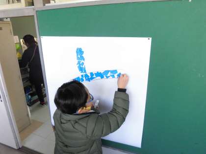 3月初旬、6年生を送る会があります。3年生は、卒業を祝うメッセージ作りを行いました。各クラスで分担した文字に、6年生が喜びそうな色合いを考え、自分達で飾り付けを行いました。