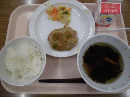 今日のハンバーグソースは、だいこんおろしをたっぷり使った和風ソースです。食べやすいように砂糖で甘さを足しています。れんこんと豆腐が入ったハンバーグと相性ぴったりです。