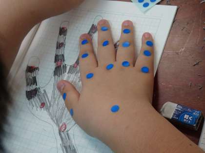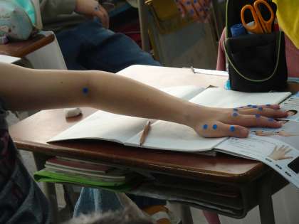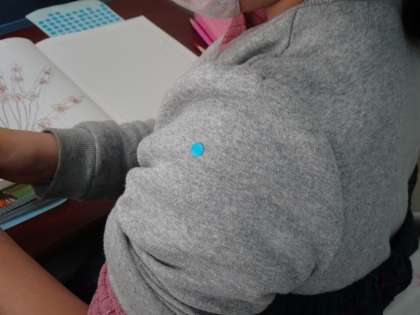 理科【4年生】 公開日 2021/02/26 更新日 2021/02/26 4年生 手や肩に青いシールを貼っています。これは、理科「人の体のつくりと運動」で曲がる部分を探す学習です。手にはあちらこちらに曲がるところがあります。この曲がるところを「関節」と言います。実際に自分の体を動かすことで、骨や関節についての理解を深めました。