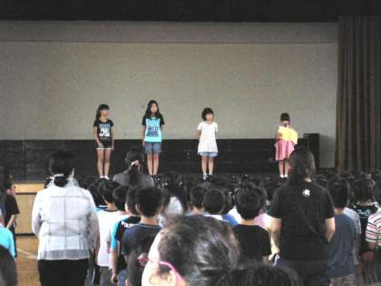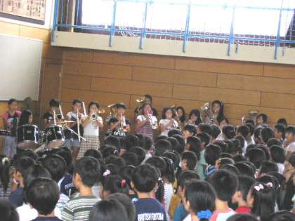 3年生と5年生の児童代表が、1学期の振り返りを発表しました。その後、金管バンドの伴奏で全員で校歌を歌いました。(7月20日)