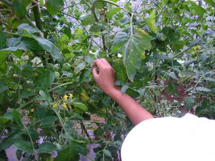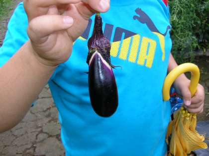 子どもたちが育てている作物がたくさん実っています。ナスやトマトを収穫に来ていました。(7月21日)