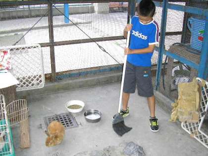 夏休みに入り、毎朝飼育委員の子どもたちはウサギの世話に来ています。(7月22日)