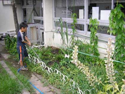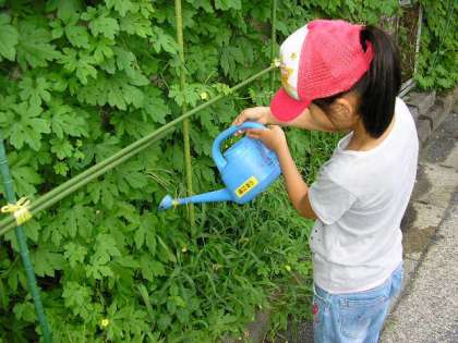 夏休みに入りました。水やり当番の子どもたちが、朝早くから来ています。(7月24日)