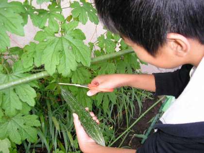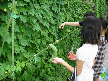 ゴーヤの収穫(5年生) 公開日 2011/07/24 更新日 2011/07/24 5年生 夏休みに入り、毎日のようにゴーヤの収穫ができるようになってきました。水やりに来た子どもが収穫しています。(7月24日)