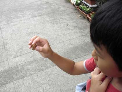 子どもが、木の葉についているセミのぬけがらを見つけました。(7月29日)