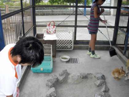 夏休みは、毎日飼育委員会の子どもたちがウサギの世話に来ています。(7月30日)