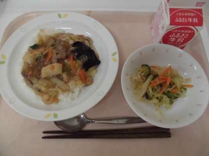 6月8日の給食 公開日 2021/06/10 更新日 2021/06/10 その他の教育活動 (今日の献立) ・中華丼 ・ピリ辛やさい ・牛乳 中華丼には、なんと14種類の食材を使っています。お肉や魚介、野菜のうま味がたっぷりで、栄養もまんてんです!