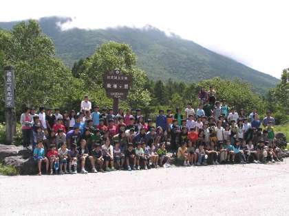 三本松で学年合同の記念撮影をしました。この後、源泉に向かっています。(8月4日10時40分)