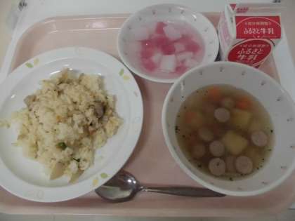6月16日の給食 公開日 2021/06/16 更新日 2021/06/16 その他の教育活動 (今日の献立) ・鶏ごぼうピラフ ・コンソメスープ ・あじさいゼリー ・牛乳 デザートは、ちょうど見ごろを迎えたあじさいの花をイメージした「あじさいゼリー」です。ぶどうジュースのゼリーとカルピスのゼリーをそれぞれ冷やし、四角く切ってシロップに浮かべました。見て美しく、食べておいしいデザートです。
